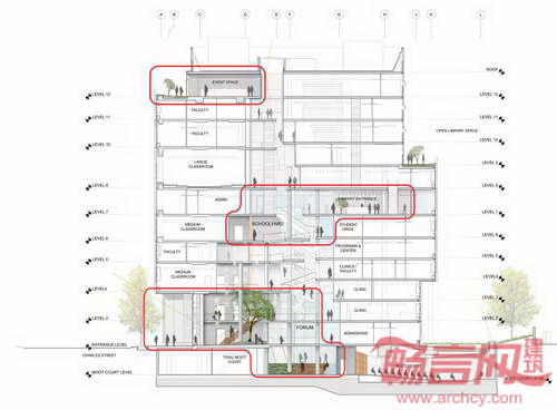 美国巴尔的摩大学为其法学院设计的一栋新建筑旨在提供现代功能要求,帮助大学为该地区文化、商业和未来发展贡献力量。大学为法学院建筑设计举办了设计竞赛,最终Behnisch建筑事务所获得了竞赛的第一名。