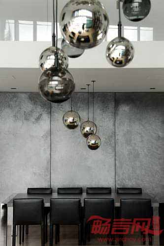 设计师希望通过种类较少的材料,达到丰富、饱满的美观层次。通过运用多种特别定制的物件,提升了建筑周边环境的魅力,包括Katie Brown手工制作的玻璃吊灯,以及David White制作的大门把手,以及Daniel Marshall绘制的餐桌背景板。