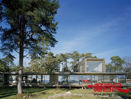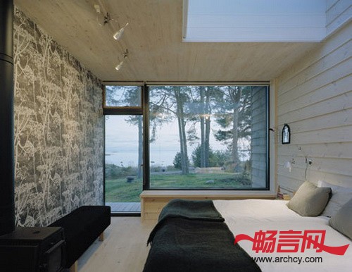 这个仿若只能在画里看到的海边松木别墅位于斯德哥尔摩市,它的屋顶上有一个大块玻璃窗观景阁楼。