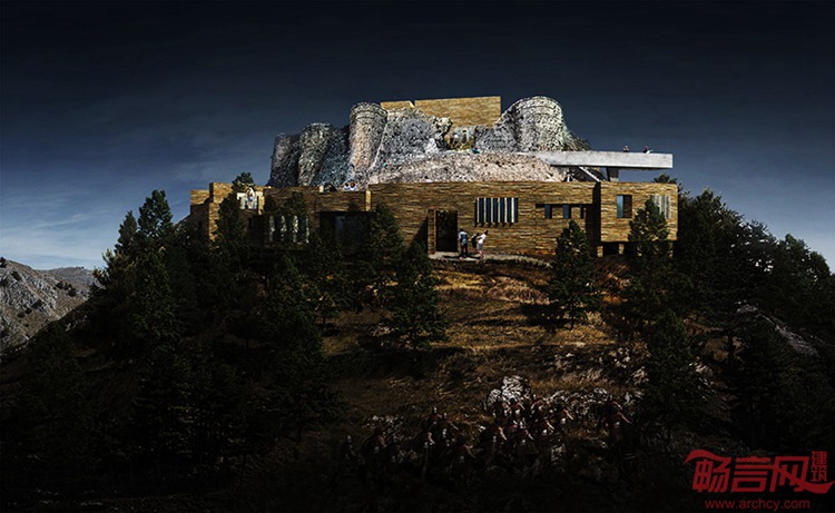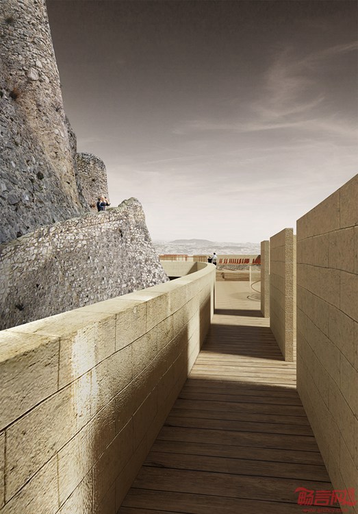 最近一个设计竞赛邀请设计师为意大利南部的城堡构想改造计划。城堡名为Roccamandolfi,Feng Xue, Kim Diep, Leonardo Lamanuzzi组成的设计团队共同完成了一项设计方案,为原古堡添加了一个新外层结构,这个结构墙面同时起到秘密通道的作用。项目要求增建方案不超过5米高,总面积不大于3000平米,城堡外最多开挖1米的深度,同时禁止对已有设施和树木的破坏。