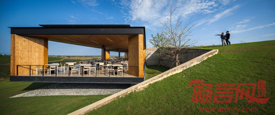 主体建筑由3部分组成,分别向外悬空伸出,而且各具不同的视角。功能区域包括就餐区、茶馆、茶叶店和卫生间等。