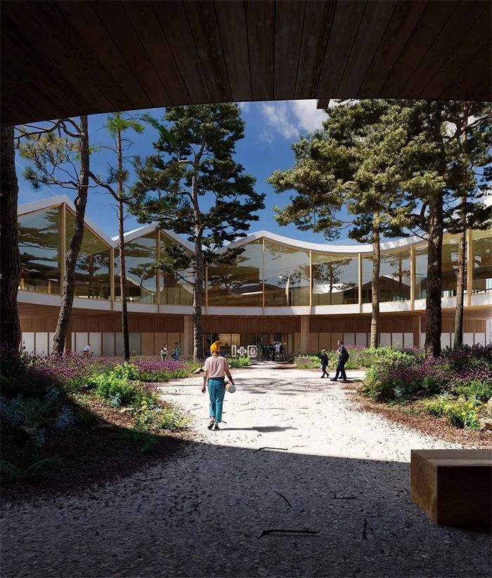 自然光、植被、大型工作区、用于社交、休息和家庭欢聚的开放空间、木结构的温暖,甚至建筑周围环境中的大片绿地,都是由于该项目旨在成为一个增进人们幸福感和舒适度的建筑。研究中心还致力于通过前卫和可持续的措施,基于对传统方法的解读与最先进技术的相结合,包括使用木结构、模块化建筑措施,以预制和工业化系统使其更高效、灵活、经济,并易于扩展。