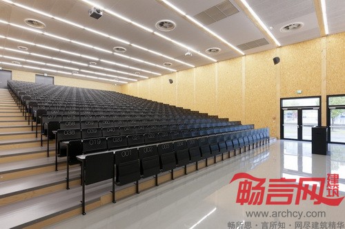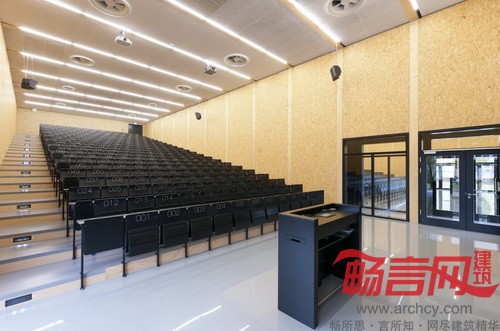 这座方形教学楼内有2个讲堂,座位数分别为479个和288个。两个讲堂之间由一个走廊连接,专供教师和残疾人使用。教学楼的门厅、洗手间和其他技术设施都设置在阶梯座位的下面,这样就能保证在有限的空间内尽可能多地设置座位。
