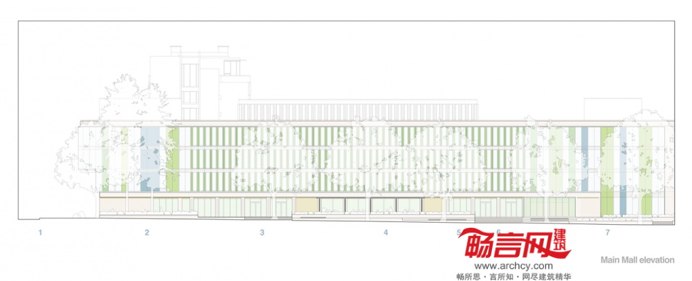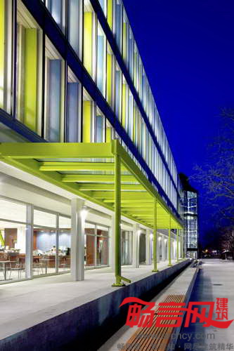 为了赋予商学院一个新醒目标识,冷峻的混凝土旧楼外观被一面闪亮的玻璃墙面替代,设计形象地代表了与电子商务和商业信息相关的模式语言——条码。为了使表现形式更为生动,建筑师使用了蓝、绿两色的木板和有色玻璃——颜色灵感出自一些英属哥伦比亚画家作品,安装在原建筑的预制混凝土结构上。