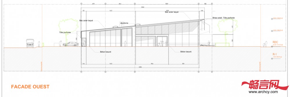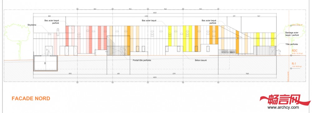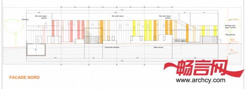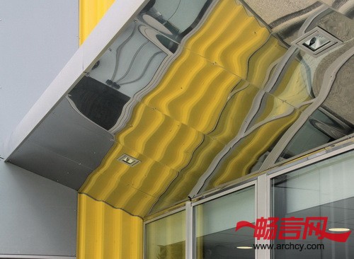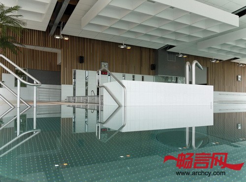 该中心的表面装饰了很多彩色的穿孔金属和水泥板条,它们重新展现了过去农业在耕田时留下的痕迹。从水上中心大厅的室内来看,这些装饰的线条构成了一顶大型遮阳棚,看起来十分活泼,也“告知”了人们,这里是个度假区。