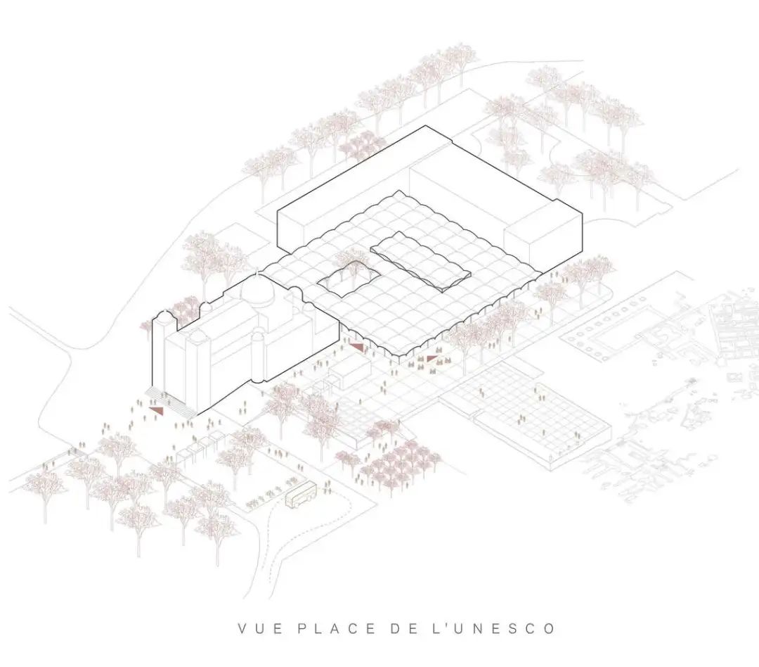 新的结构,类似于一棵树,与现场的大树建立了对话。形状像桶形的纹理屋顶也减少了垂直于太阳光线的接触面,被动地增强了室内气候。场地的整个通道区域将进行重组,定义城市流通,而开放空间将根据保护指南进行布置,并适应新的要求。