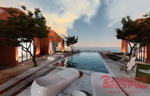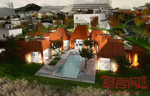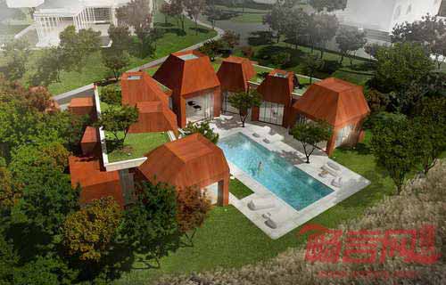 度假住宅位于济州岛南端的葛札瓦森林中,工程已于3月7日破土动工,预计将于2014年9月竣工。中央庭院带有10米宽的矩形泳池,庭院向海洋延伸。四个独立的入口区域和模块式的建筑结构使度假综合体既形成了单一体量,同时也被划分成不同住宅单元。建筑具有屋顶花园,将地标景观向垂直方向延展,营造出饱览瑰丽夜色和森林华盖的理想环境。