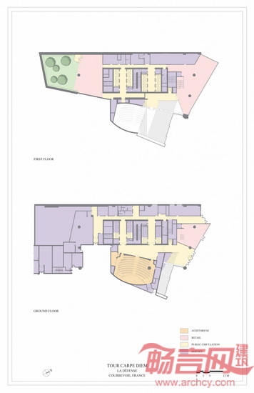 Tour Carpe Diem办公楼位于法国巴黎拉德芳斯。项目所在地区计划变得更加利于步行,环境友好。项目建筑面积45500平米,融入了城市肌理。一条人行道连通建筑花园和大堂。宏伟的楼梯延伸到Circulaire大道广场。建筑块面状外立面捕捉了巴黎不断变幻的光线,赋予其更加突出的建筑形象。