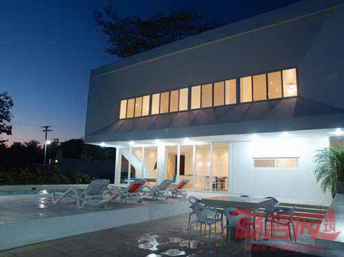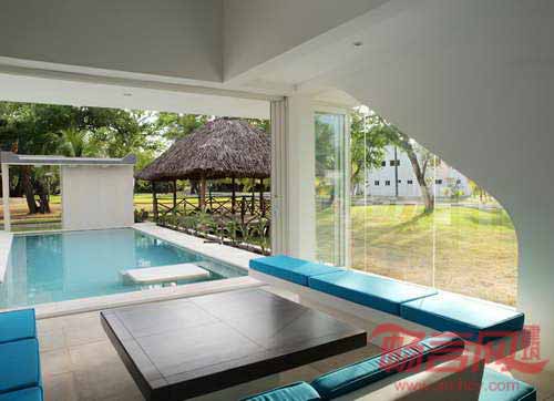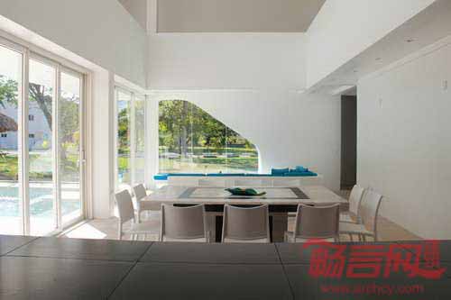 透过南向的窗户和柱子,开放区域俯瞰后院的烹饪、用餐和休息区.起居室位于泳池占地一侧,利用蓝色水元素,模糊了室内外空间的界限。这种短暂的脱离相当于通向住宅自由立面,向前迈进了一步。建筑结构使用了混凝土和混凝土砌块,与当地施工复方氨保持一致。