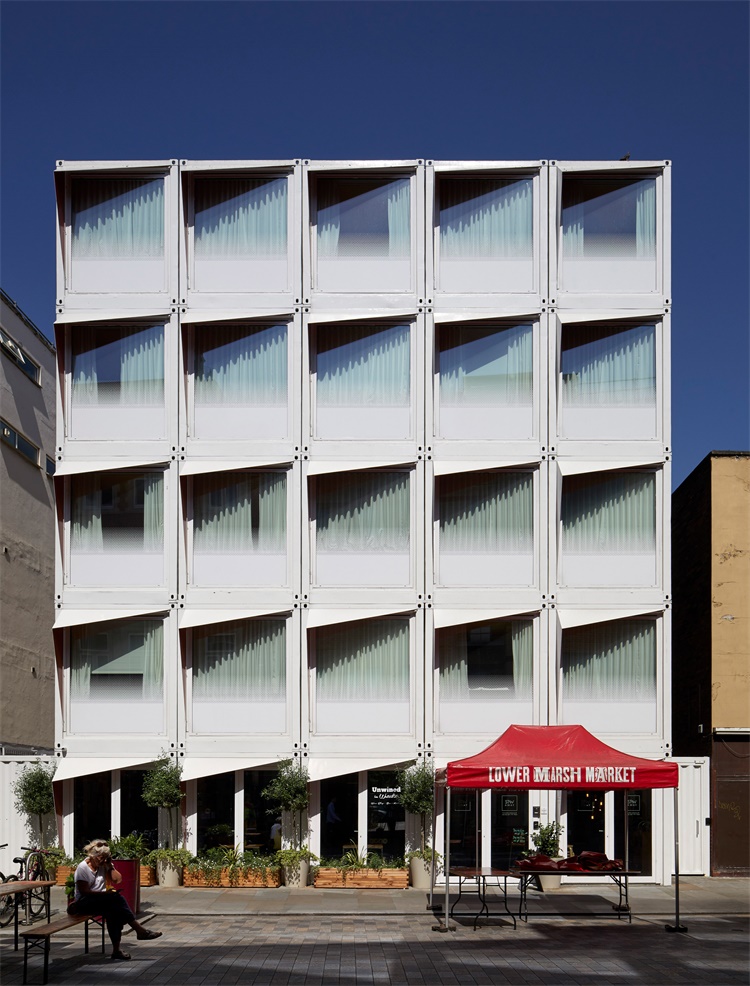 Doone Silver Kerr工作室将一些堆砌的二手集装箱改造成外墙设有几何造型遮阳板的酒店和酒吧。Stow-Away(偷渡者)酒店位于伦敦滑铁卢,采用已经使用无数次的废弃集装箱作为原材料建造。建筑有五层高,其构件是25个9米长的集装箱,每排设有五个箱子。