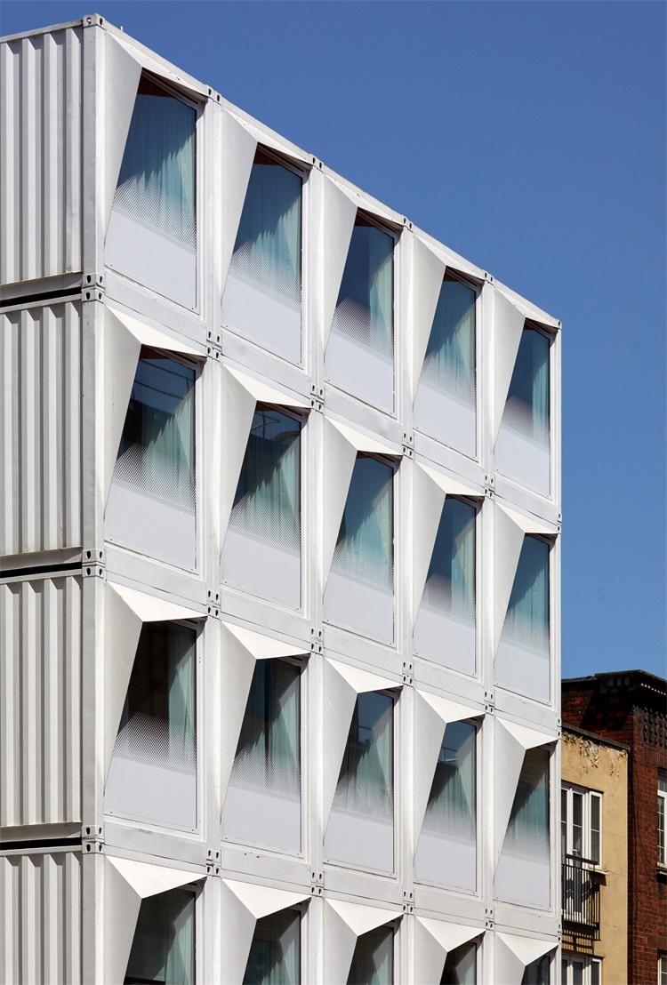 集装箱酒店临街的一侧设有宽阔的窗户,块面状的金属遮阳板在窗户一角排列齐整。