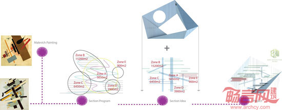 新国家当代艺术中心设计草案的核心概念是将俄国画家马列维奇(卡西米尔·塞文洛维奇·马列维奇,1878——1935)的绘画诠释成建筑语言。从建筑的各种配置到宽敞的中央空间,我们都可以体验到不同的尺度和空间联系。