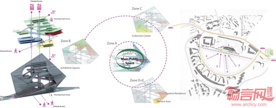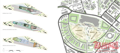 建筑造型恰如其分地诠释了建筑功能以及展品的特殊地位。根据展览的不同水平来分配相应的展览区,我们基于这个理念对内部展览空间做了设计,这种设计可以为游客提供不同的空间体验机会,使他们置身于梦幻般的环境中。室内和室外空间相互交织并形成博物馆的外部设计。