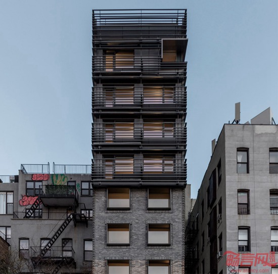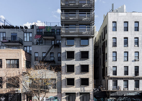 Grzywinski + Pons公司设计了位于纽约曼哈顿Allen街120号公寓楼。项目外立面包含多色调砖块、锌金属板和金属百叶窗。建筑坐落于纽约下东区LES街区,附近有若干座建于19世纪的砖砌出租房屋。项目面积达1200平米,包含20座精装房,其中16座位开间,一层设有商业零售空间。所有单元都用于长期或短期出租。