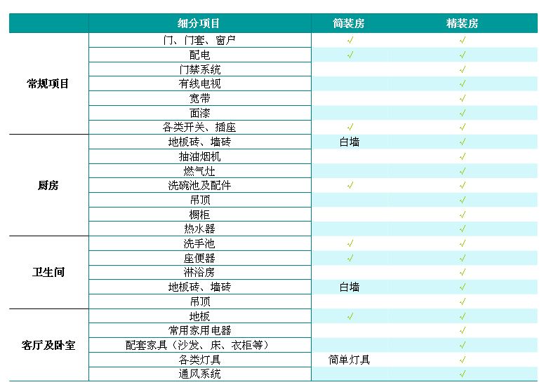 随着消费者对居住品质及省时便捷的需求越来越多,精装房已经发展成为大势所趋。据RCC了解,简装房与精装房的区别主要体现在“基本生活”与“高品质生活”,“拎包入住”已经逐渐成为了一种时尚,深受工作繁忙的“上班族”青睐。具体差别如下: