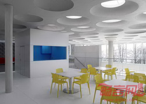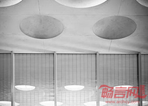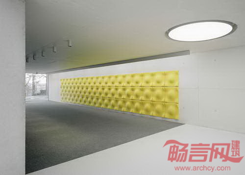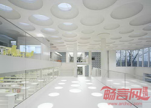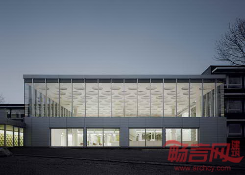 Ecker建筑事务所设计了德国Eckenberg体育馆大厅,为学校提供了社交聚会和课外活动的场地。此外,大厅还包含新图书馆、多功能室、学生休息室和咖啡厅。混凝土材质的大厅天花板上设有许多圆点状的天窗和通风窗。