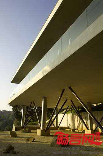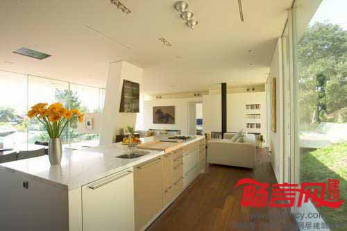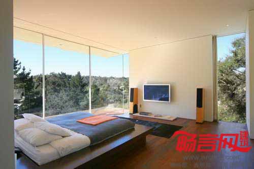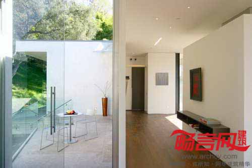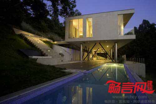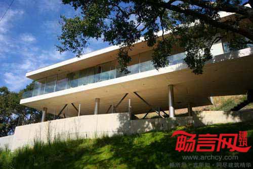 Heusch建筑事务所设计了美国加州贝弗利山Oakpass住宅。房屋由10根细柱架起,离地3.65米,从上到下全玻璃结构如同一个光滑的现代感盒子。