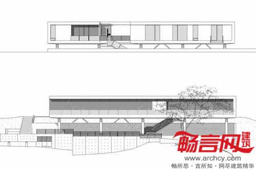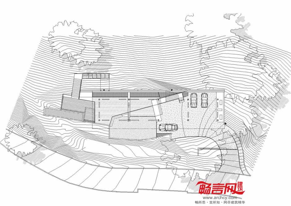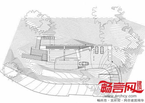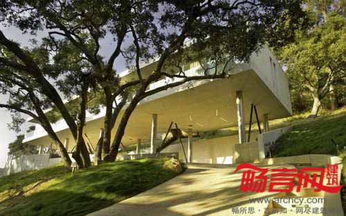 针对山脊住宅必须缩进15英尺的规定,房屋采取的创新手法不失为合理规避该规定的一个范例。由于房屋抬高的需要,在离屋15英尺外竖立了一道挡土墙,此举的另一目的在于尽量减少对周围繁茂橡树风光的影响。