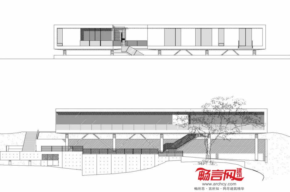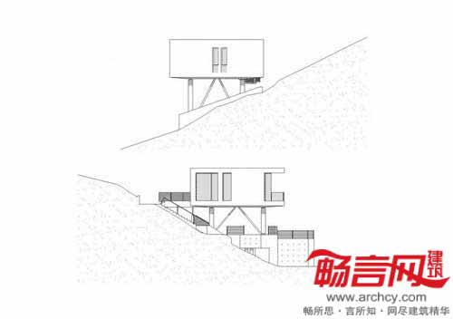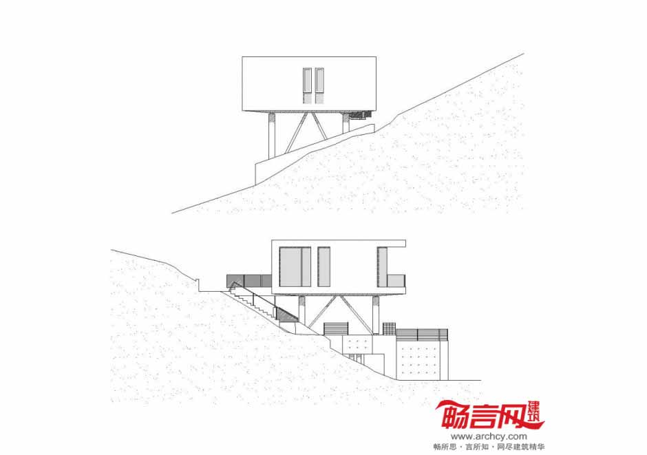 架高手法给室内带来了更好的采光条件,并利用每个房间的视野和私密性。同时,创造出房屋下方一片有趣的区域——车棚和小花园。泳池也采用了3根柱子架高的模式,西面的混凝土外立面安装了被动式太阳能存储元件。