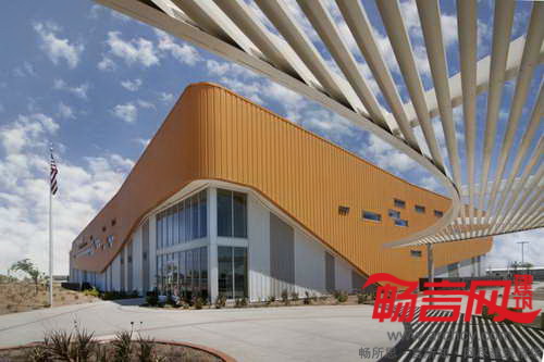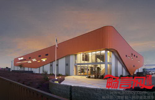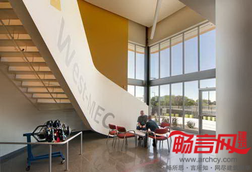 Maricopa教育中心(West-MEC)新建建筑是一所面向高中和成年学生的航空和相关特长训练中心。设计对材料和系统的选用极有创造性,并结合预制的金属结构,使项目投资发挥了最大的价值。总面积为47000平方英尺的建筑包含7间教室、训练室、会议区、图书馆、计算机机房和办公室。建筑位于一个面积为20000平方英尺的飞机库周围,它用于存放4个小型飞机,以及辅助发动机和用于训练的部件。飞机机身元素遍布建筑内外——如建筑外墙和大厅;而灯光的设计灵感来自飞机控制台的顶灯;墙壁上色彩明艳的胶带模仿机尾的装饰。这些视觉信号使学生和参观者立刻意识到这里是一个航空学习地点。主会议室灵感来自私人飞机内饰。墙壁以一个倾角与天花平面连接,使人感到置身于飞机机身中。类似于飞机在柏油碎石跑道上时使用的通讯工具,设计师使用条纹和图形对处于建筑中的人们进行引导。本建筑赢得了WESTMARC最佳西部建筑创新奖。