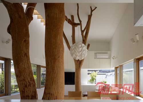 设计师决定保留下这两棵树,使之干燥,并添加在双层层高的起居室和餐厅之中。地板做了下沉,因而有足够的高度,容纳下树木。
