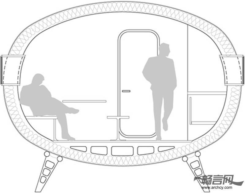小屋的后端是上下铺床和储物柜,起居室、厨房及餐桌位于悬臂部分。