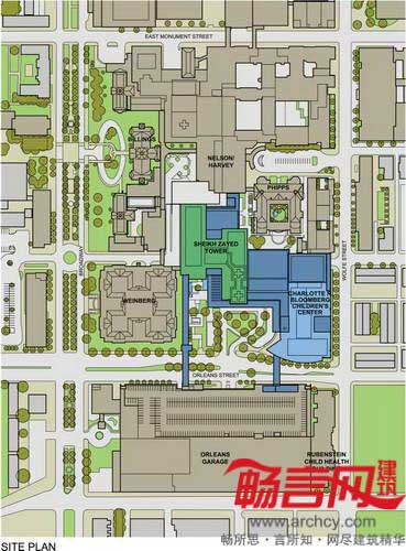 约翰·霍普金斯医院位于美国马里兰州巴尔的摩市,其新建设施综合体由Perkins+Will(帕金斯威尔建筑事务所)设计。项目设计以治疗体验为中心,融合了建筑与城市设计。项目目标是改造Charlotte R. Bloomberg儿童中心和Sheikh Zayed塔楼的治疗体验,凸显了医院以病人为中心,给予病人关怀的宗旨。