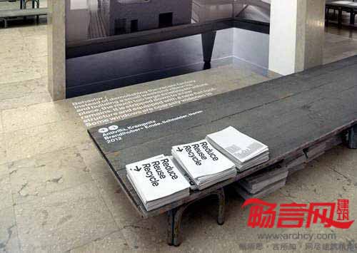 第一项原则最为关键——减少废弃物量,其后使用最少量的动力能源达到直接重复使用的效果,最终将材料转变成能够重复使用的材质。场馆的建造展现了这些原则,室内部分的装饰程度降到了最低程度。参观者从侧门进入场馆后,来到井然有序的空间内,设在不同高度的简约展示台给空间带来了活力。走道、地面和墙面上添加了照片,Erica Overmeer拍摄的摄影作品直接对重复利用措施进行了介绍和展示。