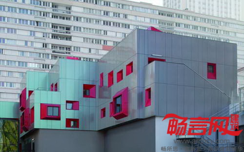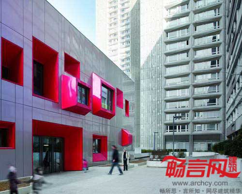 位于法国巴黎的该学校建筑围护结构对以下诸多环境目标一一做出了回应:视觉保护、抵挡四周遮阳棚、增加的天然采光、建筑热桥、天然通风。学校是首个符合巴黎市气候计划的项目。设计结果是厚实的外观,并带有多个浮雕结构:凸窗、壁龛、凹窗,在屋顶水平方向被当做天窗,并容纳空气处理设备和通风烟囱。这些多边形草莓色设计元素隐化了建筑外观,使之更为活跃生动。随着人的脚步移动、视角、天空颜色和附件建筑反射情况,铝镀层的颜色由粉色变成金灰,再转为绿色。