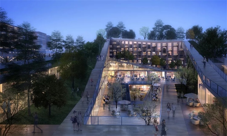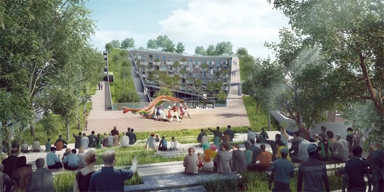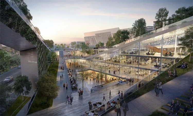 基于上述分析,市民中心需在社区中扮演多重功能角色,同时人流的组织对项目产生了巨大挑战。根据功能的要求,我们将多个水平和竖向的共享空间巧妙地穿插组合形成了具有活力的综合体,并通过连续开放的屋顶绿化平台系统连接了街道、市民中心以及购物中心,提供了阅读、社区活动、儿童游乐等多种功能,开放的社交互动平台也可以根据日后使用的不同需求转变功能 , 成为社区生活的一部分。