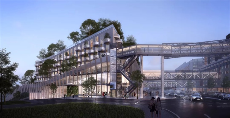基于以上要求,场地条件和步行系统衍生的体量注重水平方向的融入 ,外观以动态变化简洁精致为设计目标。功能规划布局根据朝向与功能需求,将住宅部分放置于最高的区域并主要朝向南北方向布置 , 裙楼有单独的入口大堂和疏散通道,其他公众性较强的功能则放在裙楼与地下空间,通过室外中庭空间连接各层公共空间。群楼不同方向的沿街面设有不同形式的开口,有利于各方人群的到达与疏散 ,加大朝西面开口以便于增强社区服务配套的角色与增加市民中心的亲和度。建筑设计与现有的过街桥和楼梯协调达成新旧巧妙的融合 , 通过富有地域特征的木饰材料和具有厚重感的混凝土墙面与轻盈通透的玻璃搭配形成强烈的对比 , 打造富有张力与地区特色的标志性建筑。