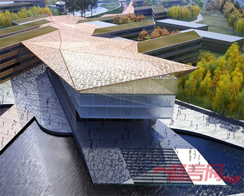 新大学校园的北部有一座标志性的6层高建筑,两条蜿蜒曲折的之字小路,穿过公共区域和建筑交汇。