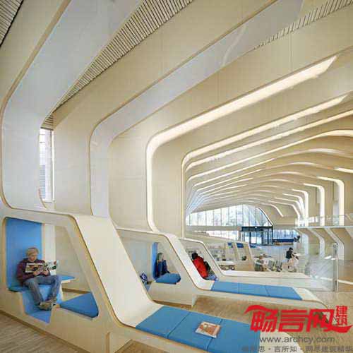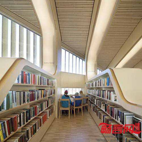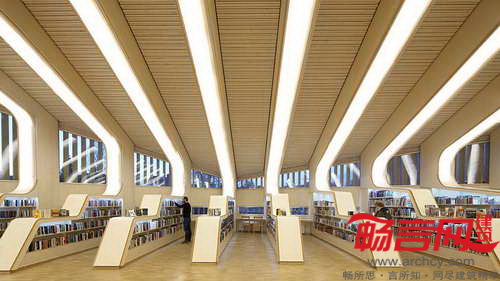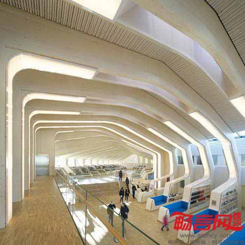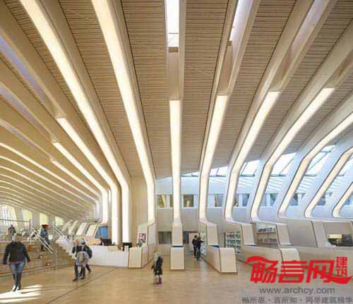 挪威Vennesla图书馆和文化中心由Helen & Hard建筑事务所设计,墙面和天花采用了木质弯梁,并结合使用了灯光、书架和座椅等设施。