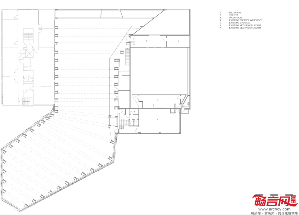 使用黏合剂合成的木梁和木柱形成了各个弯梁的结构,而空调通风管被设置在照明设施与复合板箱之间。