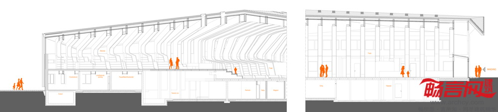 二层大厅的轮廓被27根木条环绕,横跨了包括夹层在内的图书馆和文化中心的长边。