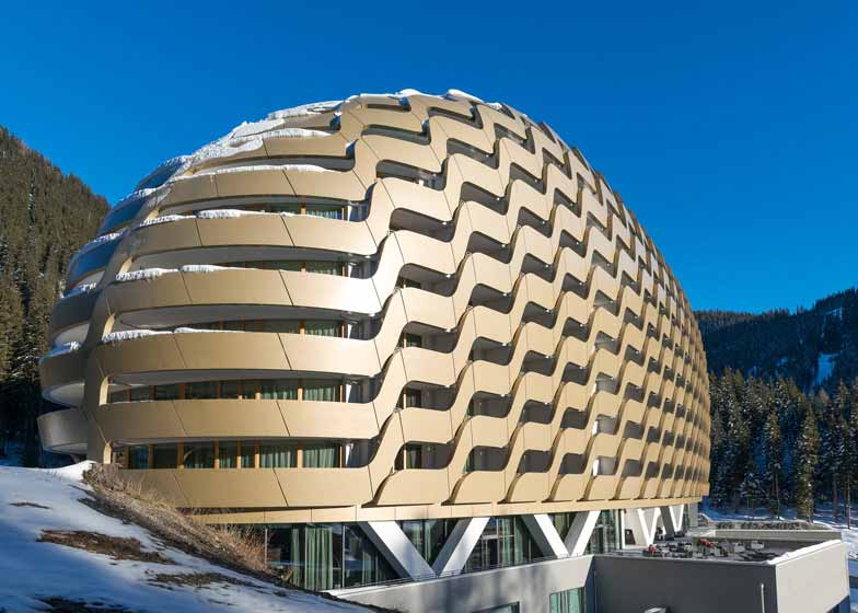 慕尼黑Oikios建筑事务所设计了位于瑞士滑雪度假小城达沃斯的洲际酒店。酒店外层设有波浪形金色钢外罩板。项目坐落在美丽的阿尔卑斯小城中,建筑师Oliver Hofmeister带领团队完成了复杂的外立面。设计师表示,“项目预算有限,质量要求很高,许多专家认为外立面几乎‘无法建造’。”穹顶建筑外部环绕了起伏形、略微重叠的钢板。设计师透露这种设计来自于周边森林中的松果。波浪形钢板形成了外立面中的开孔,建筑包含216个房间、38套住宅,具有面向高山的视野。