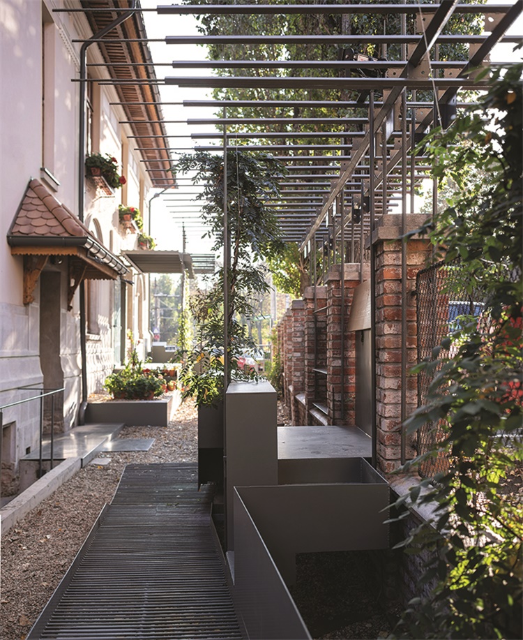 这座建筑已多年无人居住,由于渗水,已处在中度退化状态。干预工作包括对主要室内空间的各处扩建,并在各层之间形成新的空间和视觉联系,从而使室内各部分具有整体性。因此,楼板上打通了“玻璃眼”;图书区跨越两层,将老木构露明。同理,我们希望创造朝向外部环境、街道和街区的相似的开口。这些开口虽然明显,但很分散,意在通过纤细却富有表现力的由加强型钢构成的金属结构,将花园最终“呈现”出来。