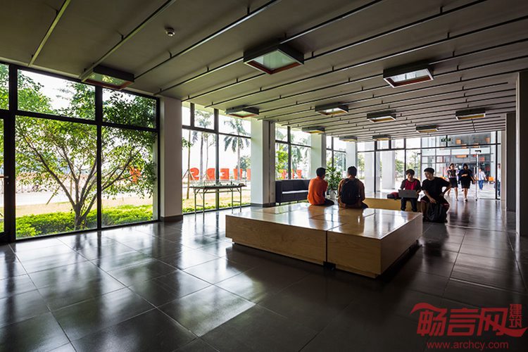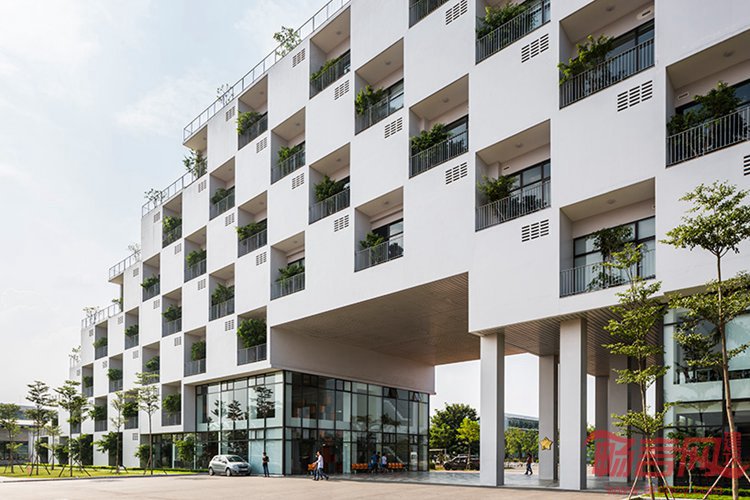 项目由VTN事务所设计,FPT科技楼位于河内,是建立带有领先环保理念的越南大学的总体规划的初期项目。作为校园门户,建筑结构包含简洁模块,带有醒目的棋盘格构造,凹陷空间设有自然植物。在这里,树木成为一层绿色表皮,降低窗户接收的热辐射。由于大学所在地区经常出现能源短缺,VTN事务所应用被动式,减少项目的能源依赖。项目削减人工照明,较浅进深保证自然采光。线性结构朝向主要风向,利用空气对流,实现降温。树木和临近湖泊帮助进一步降低气温。