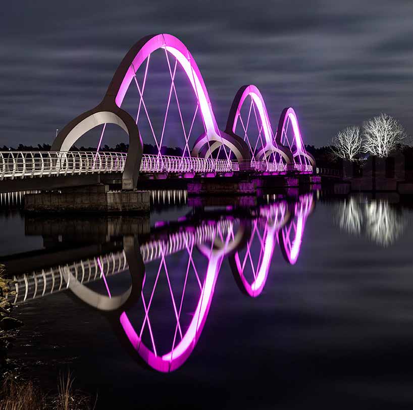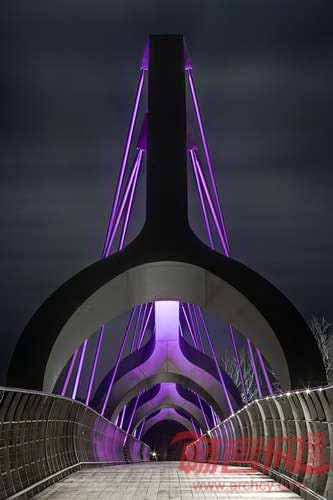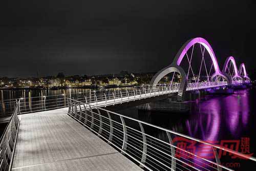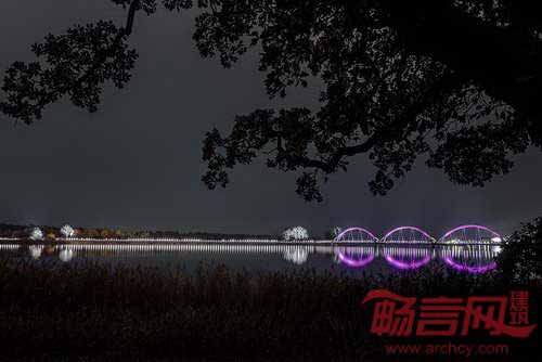 Ljusarkitektur建筑事务所设计的Solvesborg桥配合独特的灯光照明方案,提升了其作为建筑地标的地位。项目采用Lumenpulse出产的变色LED照明产品,装点了这座被认为是欧洲最长的自行车和行人高架桥。为了凸显醒目的户型结构,总长756桥身上安装了照明灯。此外,为了不对当地野生动物产生不利影响,设计公司添加了深色的定制遮光设备,遮挡了光源。受地区动植物影响,设计公司在全年不同季节进行灯光颜色次序调整。