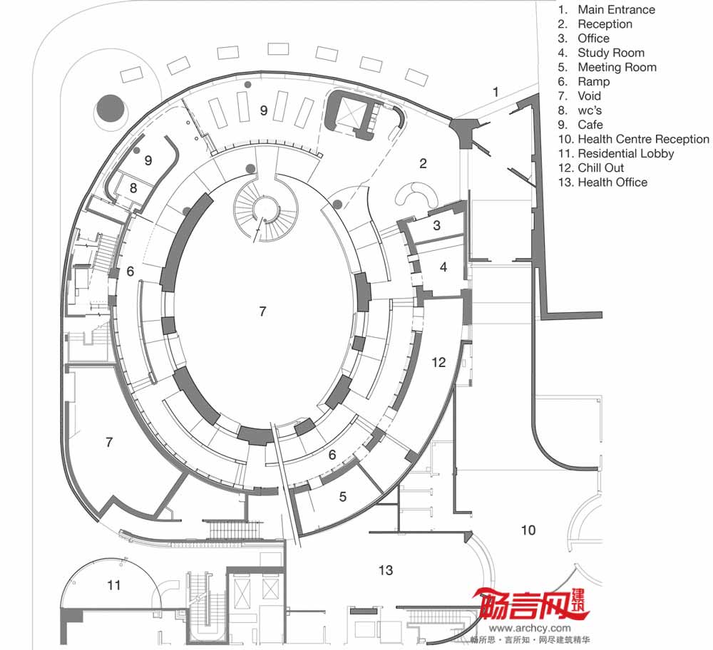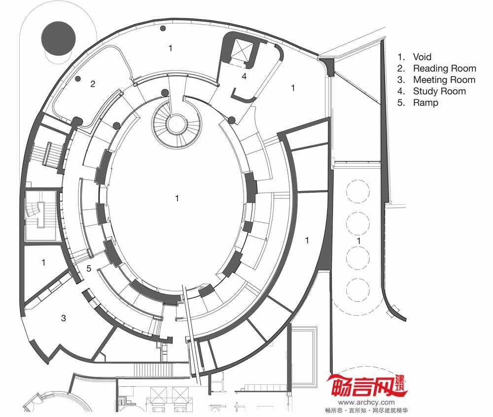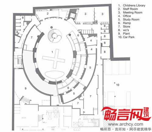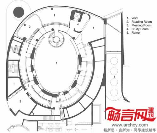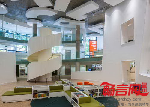 在图书馆内部,从地下层的咖啡厅和儿童图书馆到一层的阅览室,沿着宽阔的螺旋状斜坡一路向上摆放着图书架。