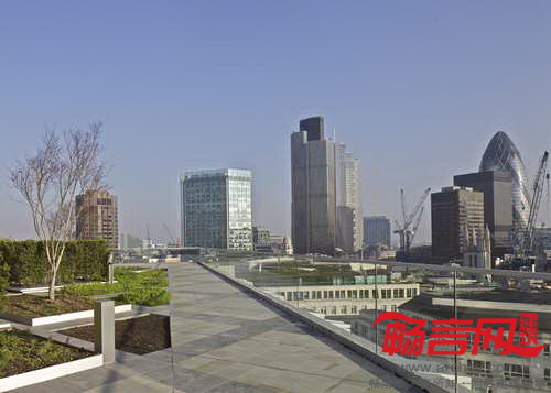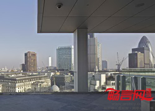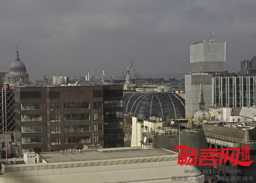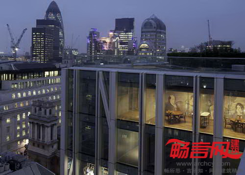 玻璃立方体从屋顶凸出,并在高度上俯视周边建筑——包括James Stirling设计的家禽街一号大楼和Christopher Wren设计的圣史蒂芬·沃布鲁克教堂。