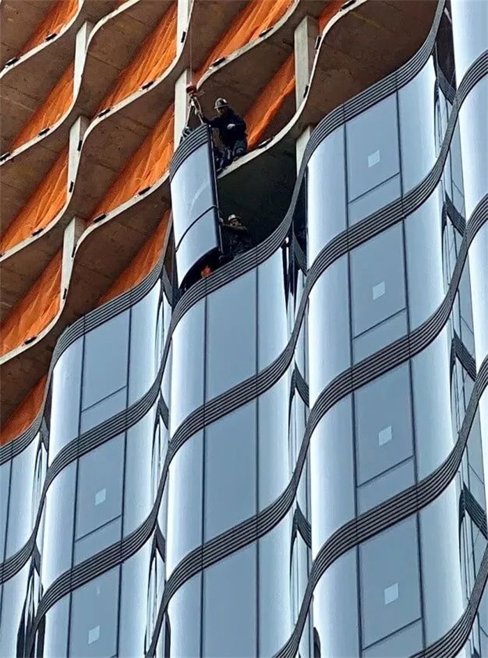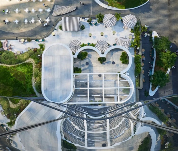低层休闲层的外墙以及每层高层之间的护墙板均由黑色条纹花岗岩构成,勾勒出建筑的轮廓,有助于清晰地展现其引人注目的弧度。在主塔楼后面,两层高的扩建部分设有零售和餐饮空间,并以一个屋顶露台收尾。在露台的顶部,是一组与主楼相呼应的弧形凉亭,采用轻质铝和玻璃包覆,内设一个精品屋顶酒吧。
