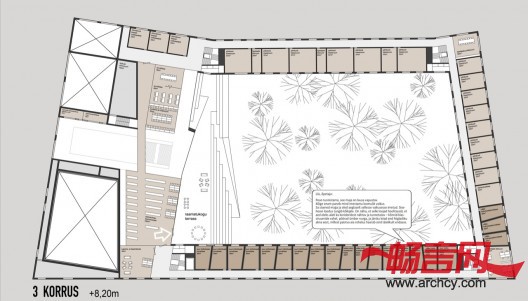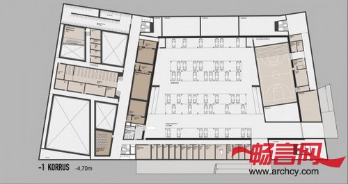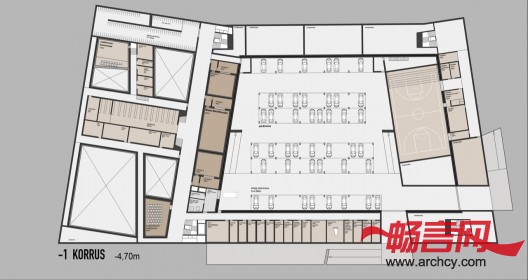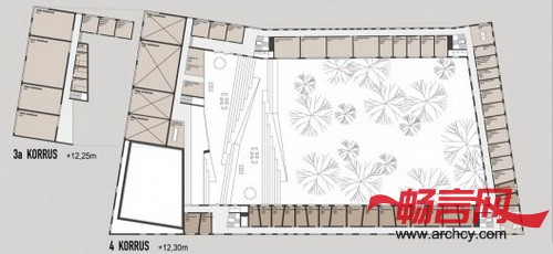 在设计建筑的功能分区的时候,空间的灵活使用是一个重要考虑因素,因为这样能与建筑里需要经常变换使用空间的功能相适应。公共空间(例如音乐厅)面朝人来人往的街道,而音乐室和宿舍则靠近静谧的花园。此外,建筑的室内还可以进行再次布局,这就可以满足学校未来建造更多功能区域的需要。各个楼之间的距离很大,这便能让花园遍及各个大楼,而每座大楼的玻璃窗则将室内与自然连接到了一起。