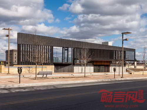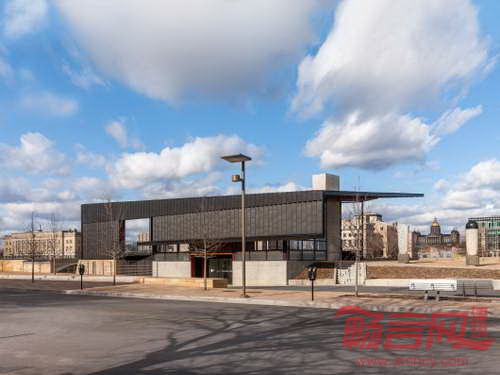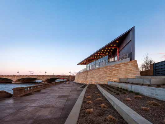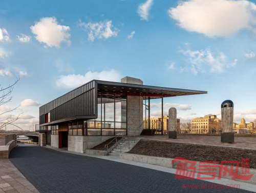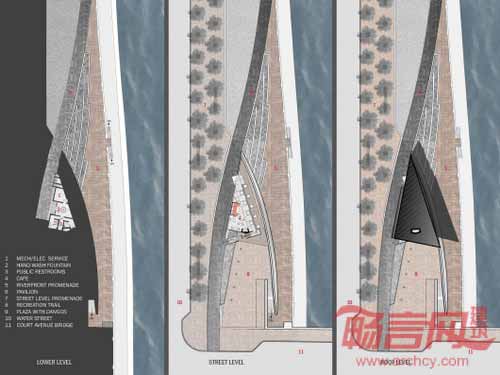 该广场加场馆项目面积为2200平方英尺,占据了美国爱荷华州Des Moines市中心Des Moines河岸的醒目地段。建筑是新建主河道项目的重要部分,这一耗资5000万没有的公私合作项目将恢复河岸区域活力,将城市居民重新带回沿河两岸。建筑毗邻新旅游铁路和漫步大道,位于Court大道桥梁的西端。三角形建筑被构想为一个水晶空间,位于和缓坡道一端。船形广场周边是邻近铁路、道路和景观道。“水晶”外侧添加了一层黑色的锌金属表皮。二层咖啡厅为锌表皮未覆盖区域,为人们提供了视野。