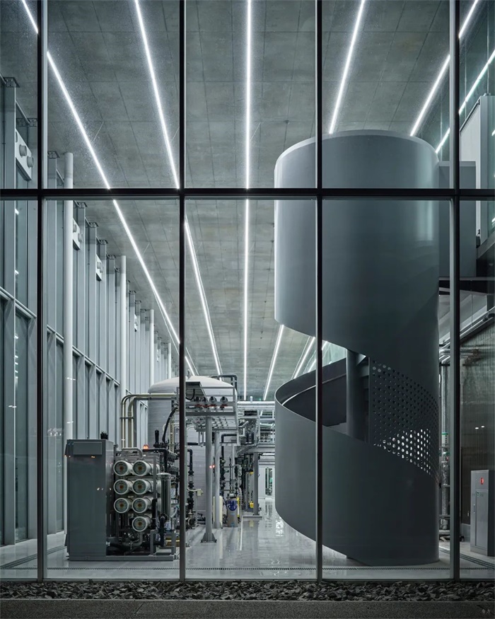 另外,建筑外观的设计以水处理中使用的管道为主题,选用金属管材作为装饰,不仅能遮挡阳光、安装进排气和雨水管道等设备,还营造出一种仿佛被水环绕的外观效果。