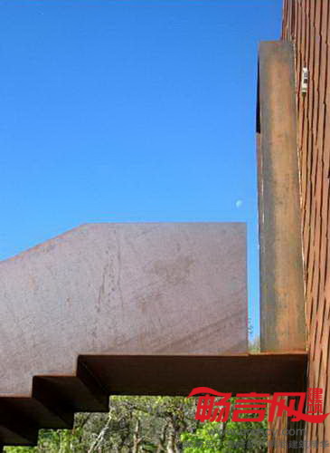 建筑覆层是回收钢,锈色与峡谷的落叶色泽相仿。