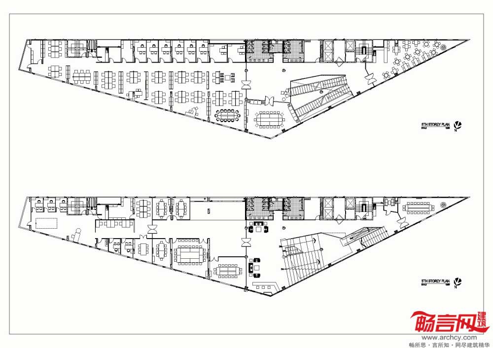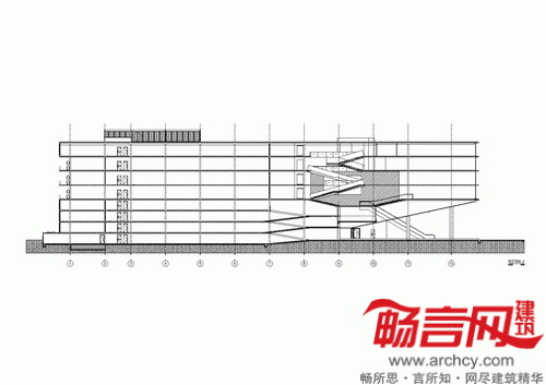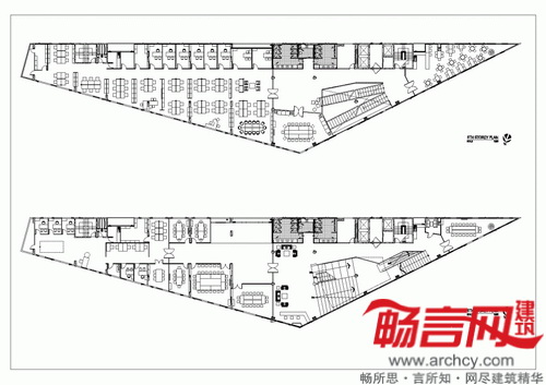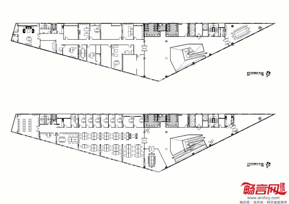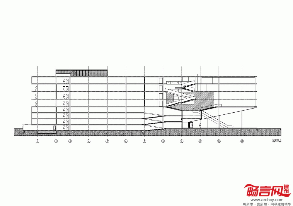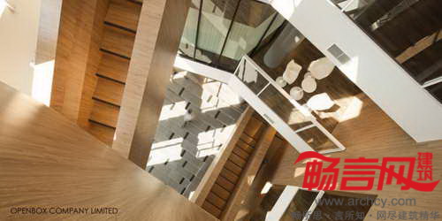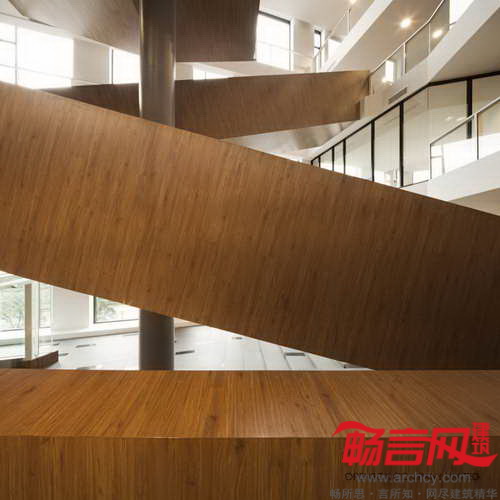 建筑内部中庭通往所有办公楼层。楼梯设计成延长型,不经意地被安放在中庭中央。