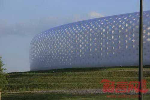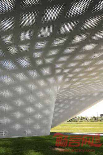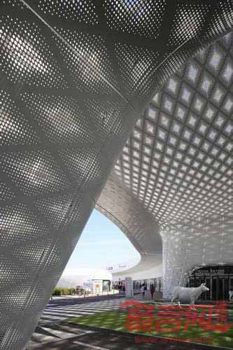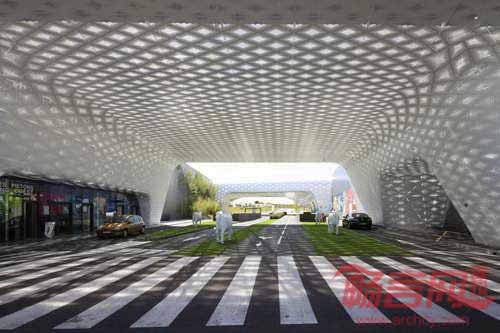 建筑的覆层同时也覆盖了内部区域,一直延伸到连廊、屋顶,形成了商场前大道的遮阳棚。