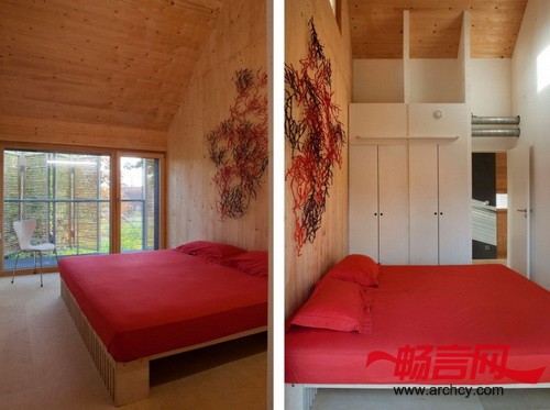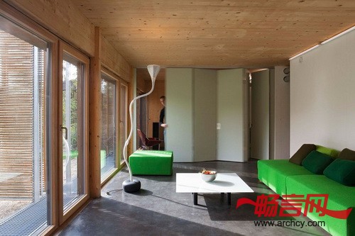 “这是一座没有供暖系统的住宅。窗户和预先定制的墙壁的保温性很好,它让住宅的热源只是阳光和住户本身就可以了。热回收通风在不用加热的过程就能够提供新鲜空气。