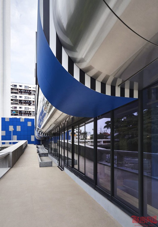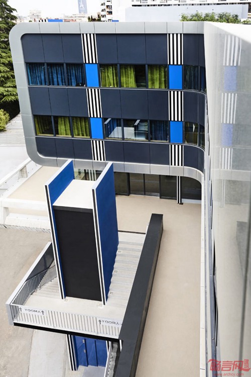 Ora Ito工作室完成了巴黎Yooma新建酒店建筑设计。酒店艺术设计由Daniel Buren负责。坐落于塞纳河畔,建筑成为埃菲尔铁塔一侧重要的地标。建筑增建了新楼层,让客房总数达到106间,可容纳宾客434人。在一系列框架工作完工后,Daniel Buren实施了深蓝色的全套装饰工程。这一色彩结合外立面的铝板材质,创建了图画属性的建筑。视觉语言在室内得到了重复,走廊和大堂还另外增加了黑白线条元素。